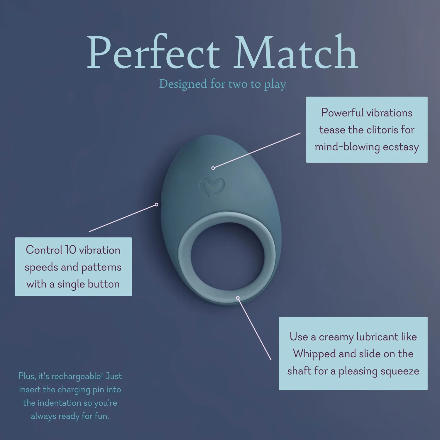 Your deepest desires have met their match. A must-have for any bedroom adventure, Perfect Match enhances partner play with 10 speeds and pulsing patterns of tantalizing vibration. Slide the flexible silicone ring over the penis and turn the cock ring’s vibrating surface toward the clitoris for mind-blowing ecstasy. After all, sharing is caring.